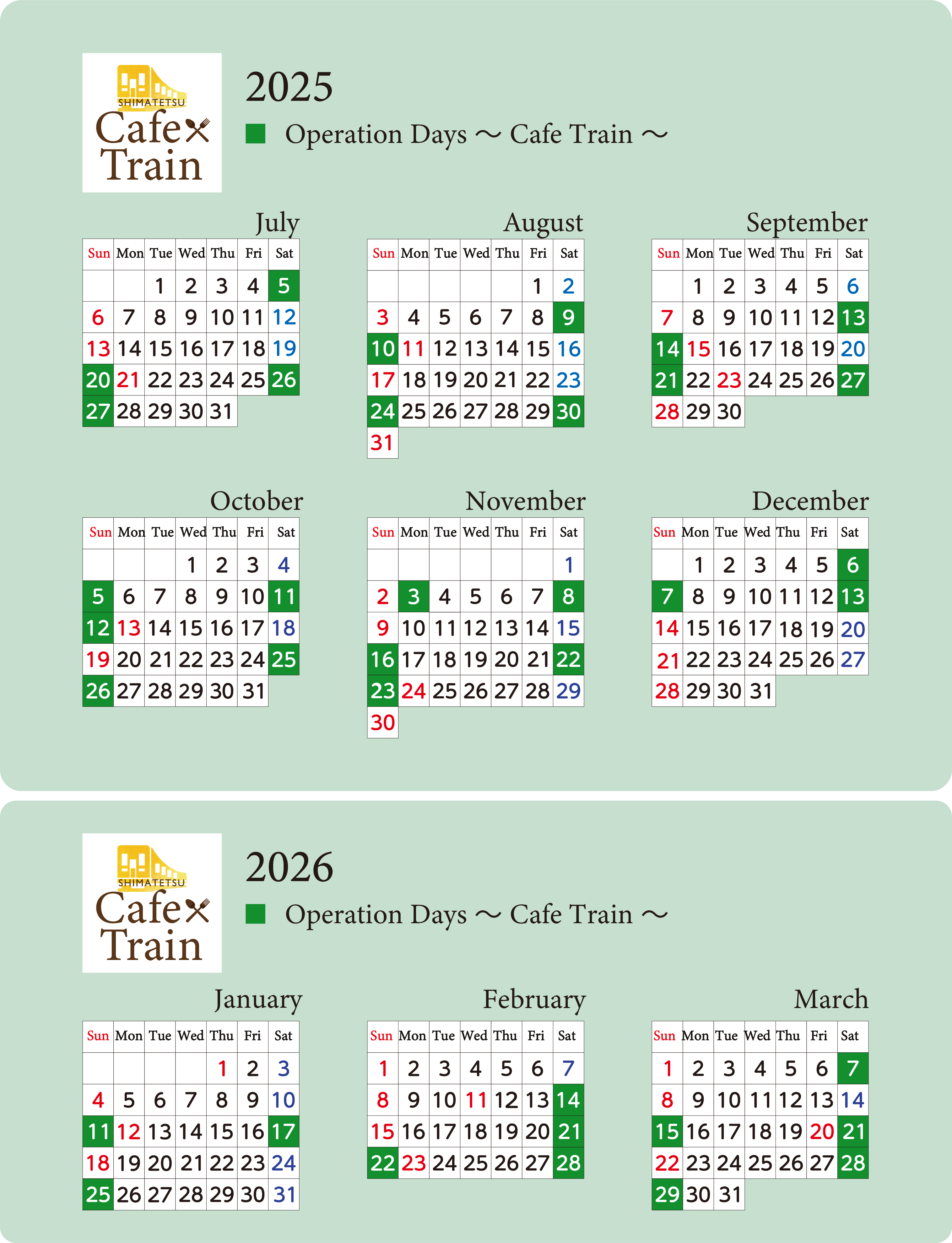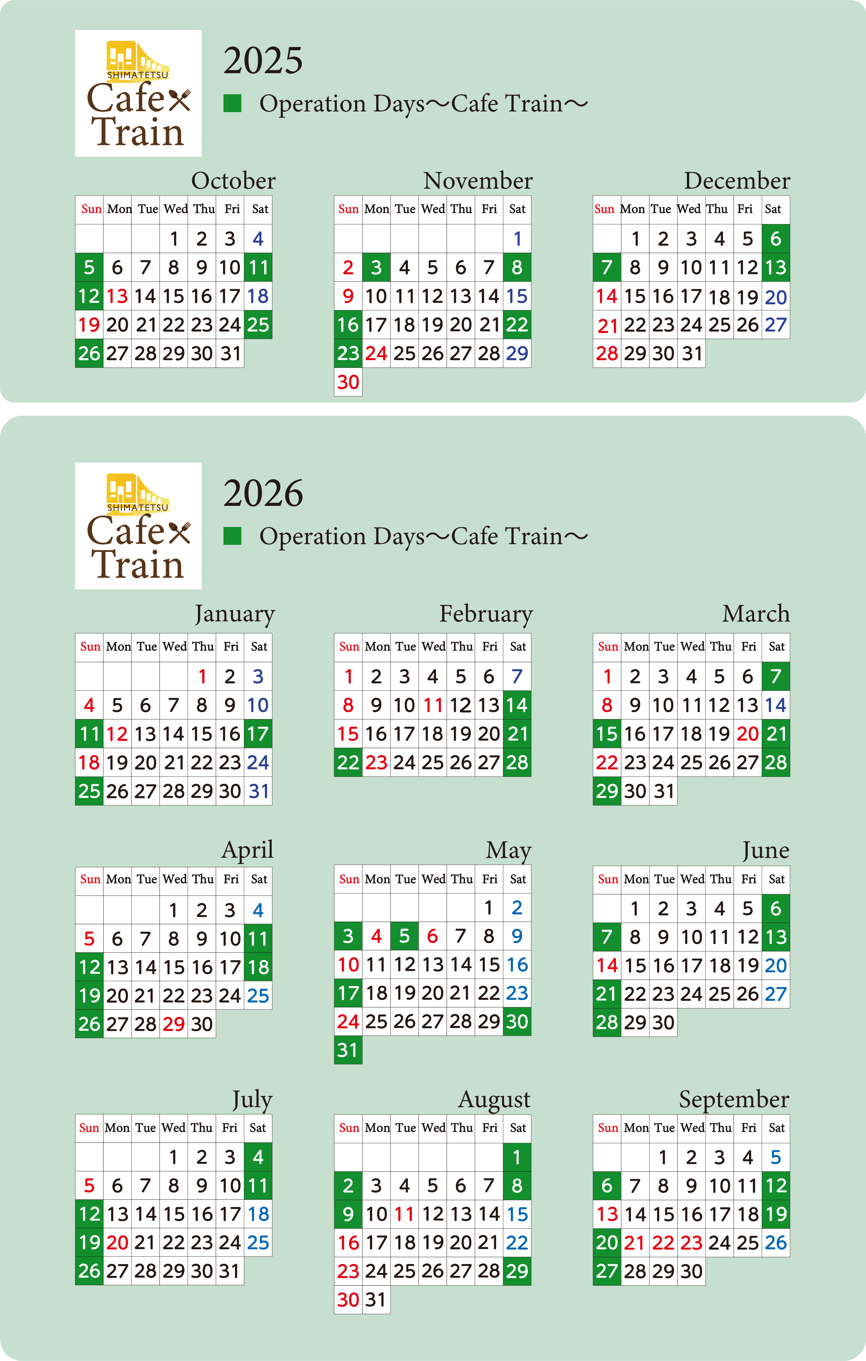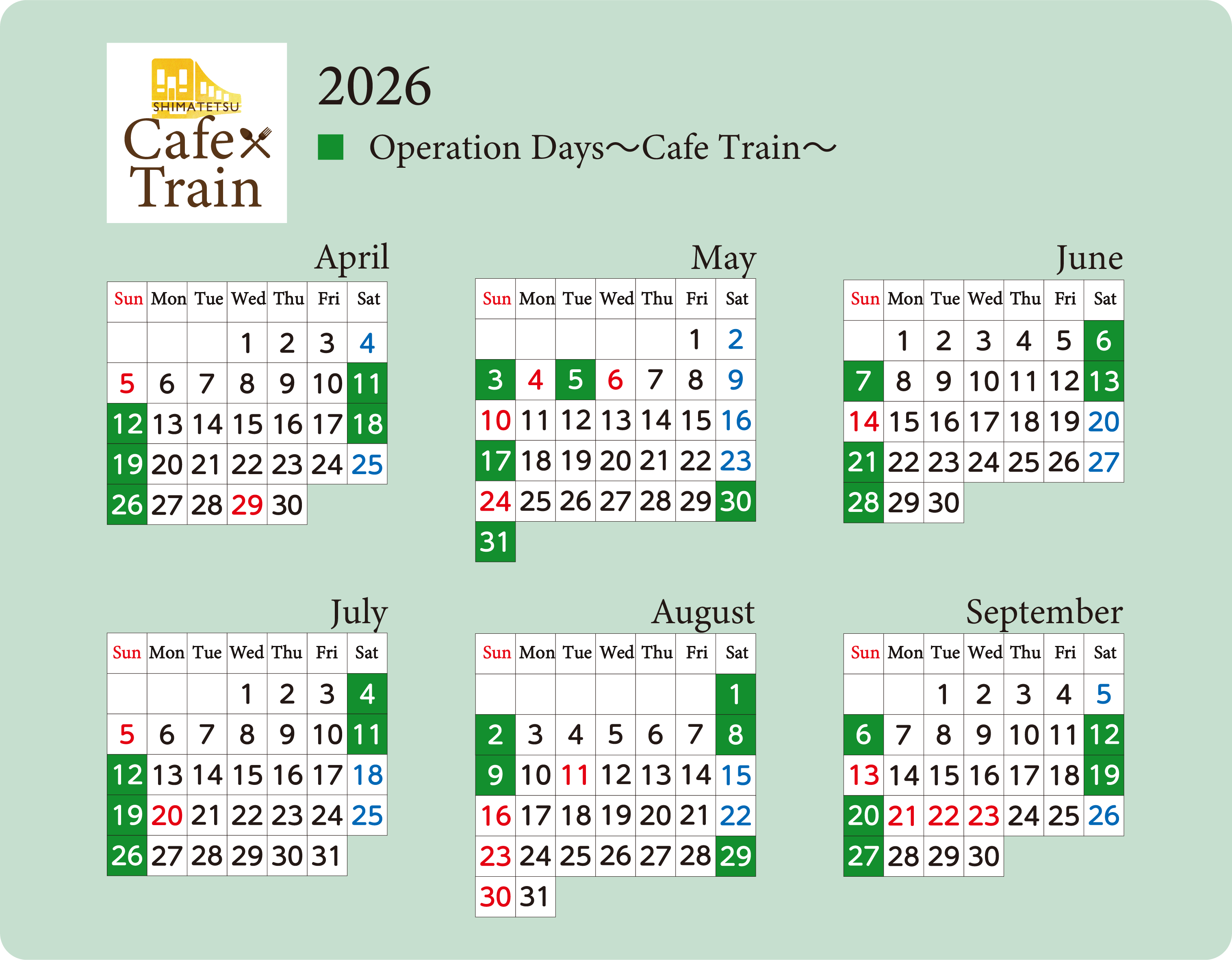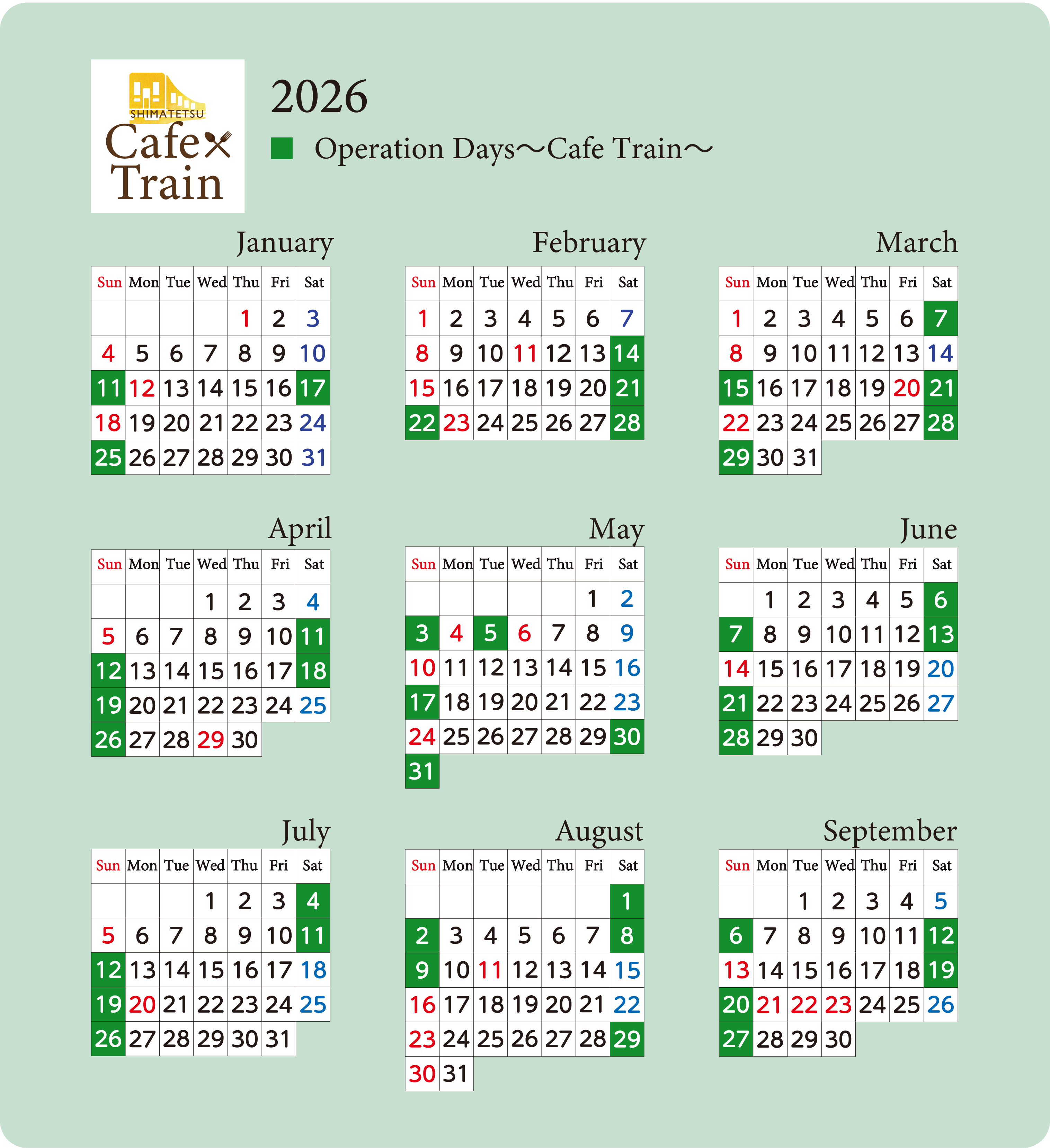 “Shimatetsu Café Train” runs on a scenic railway route from Isahaya to Shimabara in Nagasaki Prefecture. It is a traveling café that allows you to enjoy delicious dishes and sweets from the Shimabara Peninsula. While you taste the delicacies, you can enjoy the scenic landscape, the idyllic countryside, the beautiful sea and spectacular Mount Unzen. We are sincerely looking forward to showing you the beauty of Nagasaki.
