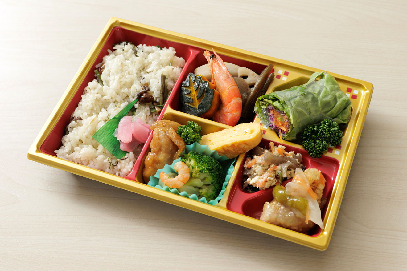 生春巻き、季節の煮物、野菜海鮮炒めなど旬の地元野菜を様々な食感と味付けで楽しんでいただけるお弁当です。