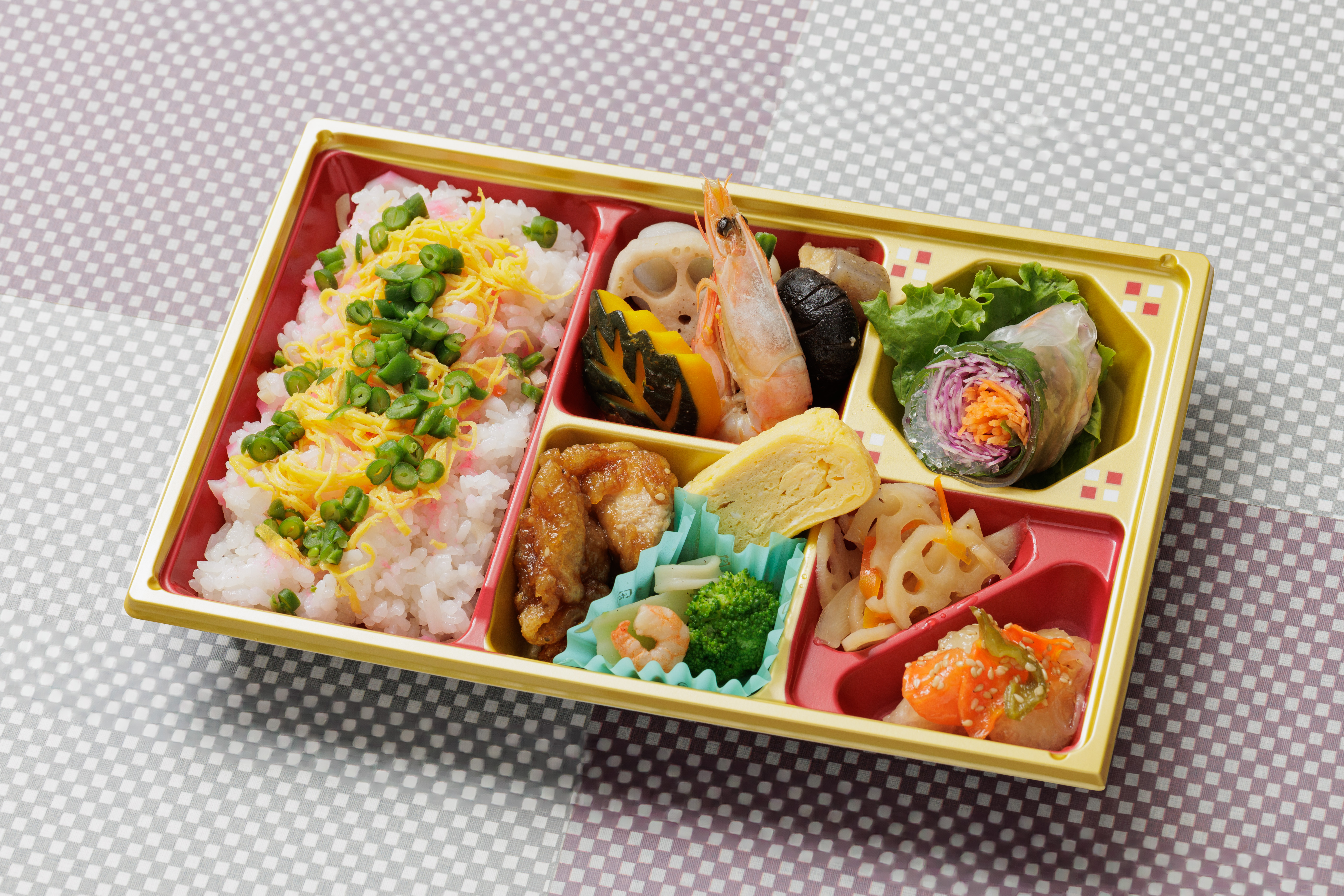 生春巻き、季節の煮物、野菜海鮮炒めなど旬の地元野菜を様々な食感と味付けで楽しんでいただけるお弁当です。